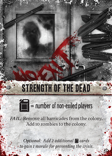 Помимо условия победы, на карте общей цели также указано, сколько раундов есть у колонии на её достижение. Максимально партия может длиться десять раундов. День выживших начинается с того, что сперва тянется карта кризиса с мини-заданием, которое игроки должны выполнить к концу текущего раунда. Разумеется, провал задания ничего хорошего не сулит. Механика прохождения схожа с кризисами в Battlestar Galactica: игроки по очереди подкидывают в общаг карты (в данном случае не цветные, а с определёнными символами), потом тщательно их перемешивают, после чего подсчитывают результат, причём ненужные символы тут также идут минусом. Как видно, преодолеть кризис можно только, работая сообща, ведь в одиночку собрать необходимые карты практически нереально.