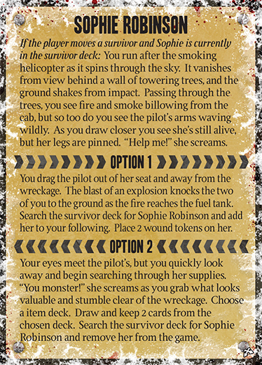Когда во время вылазок герои сталкиваются с другими выжившими, то они могут решить, взять их в свой лагерь или оставить на съедение мертвецам. Дополнительные рты могут стать обузой для колонии, но с другой стороны ещё одна пара рук в быту не помешает (за каждого нового выжившего игрок получает дополнительный кубик действий). Незнакомцев можно встретить блуждающих в одиночку, вдвоём или втроём, но далеко не все из них “одинаково полезны”. Если вы наткнулись на группу из трёх человек, то только один из них окажется годным для колонии, остальные же будут просто занимать место и уплетать запасы еды. Тематически, один является главарём или опекуном, а его товарищи – детьми, пожилыми людьми или ранеными.
