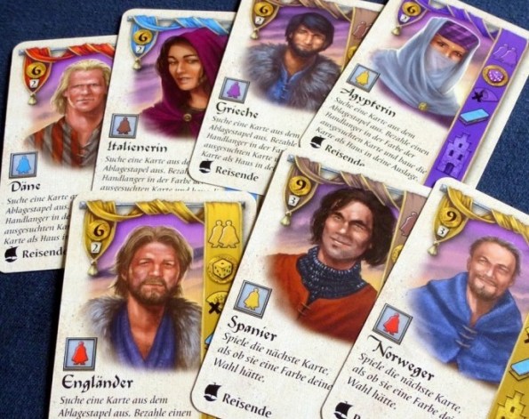 Данный модуль включает в себя новые карты персонажей, которые замешиваются в общую колоду. Всего их 40 штук: по 2 карты к каждому сословию из базы (всего 22) и 17 персонажей, принадлежащих к новой группе “путешественники”. Вы скажите, что в сумме получается 39, и будете абсолютно правы. Дело в том, что для обладателей первой редакции игры в комплект вложена исправленная карта гравёра (Engraver). Теперь его свойство приносит по одному очку за каждое сословие вместо двух, а стоимость снижена с 12 монет до 9.