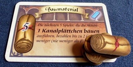 Игрок может выполнить действие любой из доступных в заливе лодок только, если для постройки канала была сброшена карта, а не применено особое свойство персонажа. Кроме того, он должен доплатить рабочим такого же, как и лодка, цвета. После применения жетон с поля убирается. Действия могут быть следующие: нанять 3 рабочих любого цвета, взять 6 монет, скинуть 2 жетона угрозы (и, как обычно, получить за это 2ПО), активировать любого из своих “одноразовых” персонажей повторно, продвинуться на одно деление на треке влияния и, наконец, взять и сыграть карту из любой стопки добора.