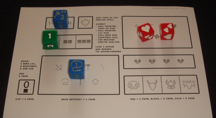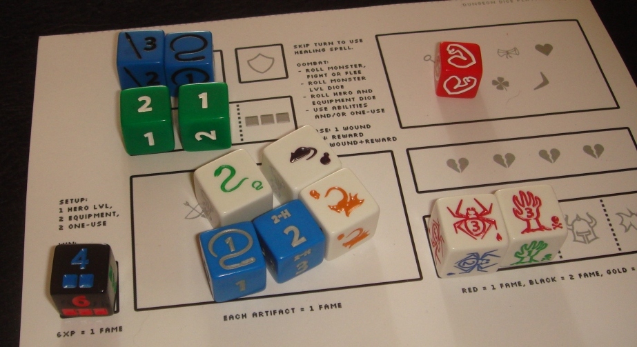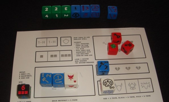 На старте приключения каждый игрок случайным образом тянет два оружия (синие кубы) и два магических эликсира (красные). Помимо этого все получают по кубику силы зелёного цвета, который, по сути, работает так же, как и оружие, только не имеет никакого свойства. С опытом сила приключенца растёт, и, к примеру, прокачав своего героя до третьего уровня, игрок пополнит его арсенал дополнительным зелёным кубом.