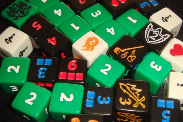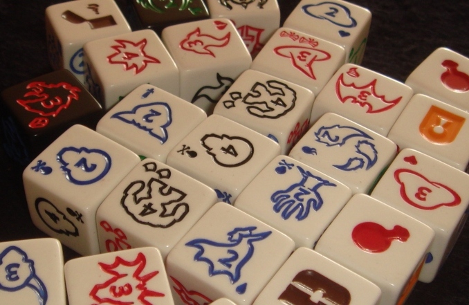 Итак, мы вытянули монстра и бросили его. Уровень указывает, сколько атакующих кубов бросает враг, а мелкие значки в нижнем правом углу – это его способности. Далее кидаем свои кубики, и кубики за монстра, после чего сравниваем результат: у кого больше, тот и победил. Но перед этим и герой, и монстр, могут активировать выпавшие на кубах свойства (за монстра решает игрок слева). Чтобы было некое представление, перечислю некоторые из них. К примеру, одно позволяет сперва бросить свои кубики, а потом решить, драться или нет; другое разрешает забрать у врага кубик с самым низким значением и добавить его к своим, третье вообще может перезапустить бой заново. Вдобавок, во время боя игрок может пользоваться любыми своими эликсирами. Эликсиры в отличие от оружия одноразовые. Эффектов тоже тьма: можно вылечиться (после неудачного боя у героя отнимается один кубик, который кладётся в поле ранений), банально добавить силы в бою, понизить уровень монстра, либо, наоборот, повысить (чтобы урвать побольше очков) или даже превратить врага в беспомощную лягуху.