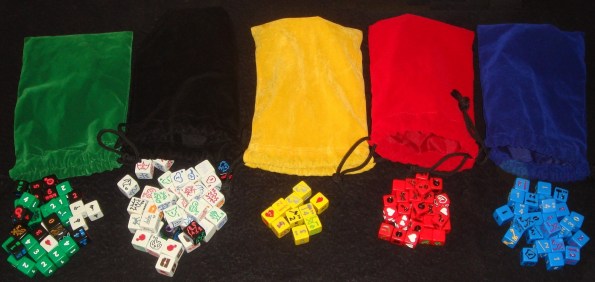 В игре только кубики, кубики и ещё раз кубики. Все они рассортированы по разноцветным мешкам – каждому типу свой мешок. Коробки тут нет, всё помещается в ещё один, но уже здоровенный чёрный мешок с логотипом игры.