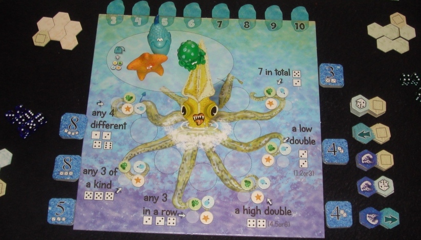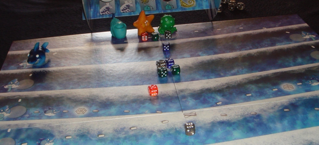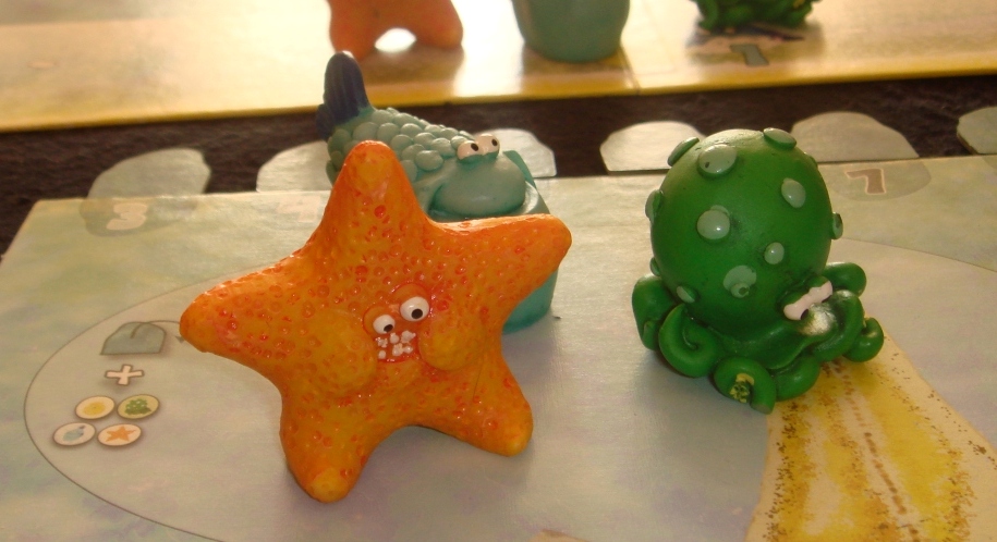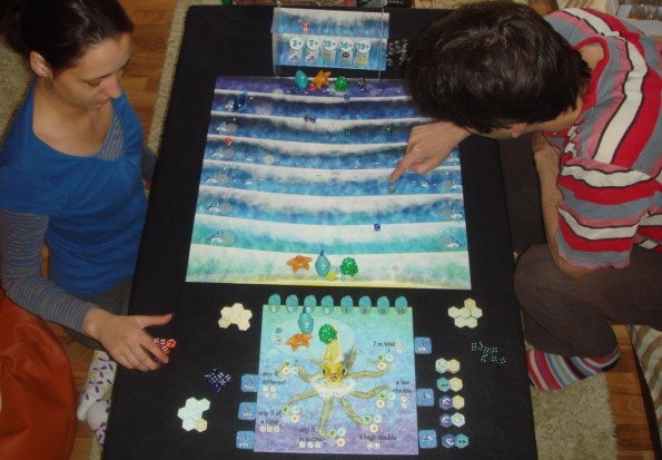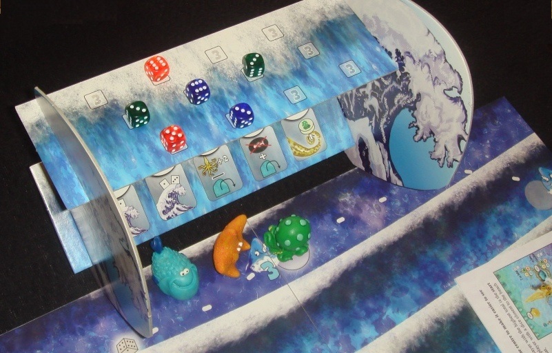 Помимо забавной темы, в игре ещё множество забавных механик. Во-первых, спасать своих подопечных нужно, собирая покерные комбинации из кубиков (нужно ходить по полю и кушать кубы). Во-вторых, кубики игроков попадают на игровое поле благодаря хитрой конструкции. Как только все места заполняются, устройство опрокидывается, и кубики рассыпаются по секторам. В-третьих, тут можно прокачивать своих существ! Дело в том, что действия, которые доступны игроку, диктуются его коралловым рифом, формируемым из специальных тайлов. Риф можно отстраивать в ширь и ввысь, улучшая тем самым эффект действия.