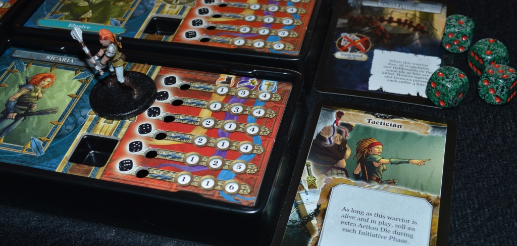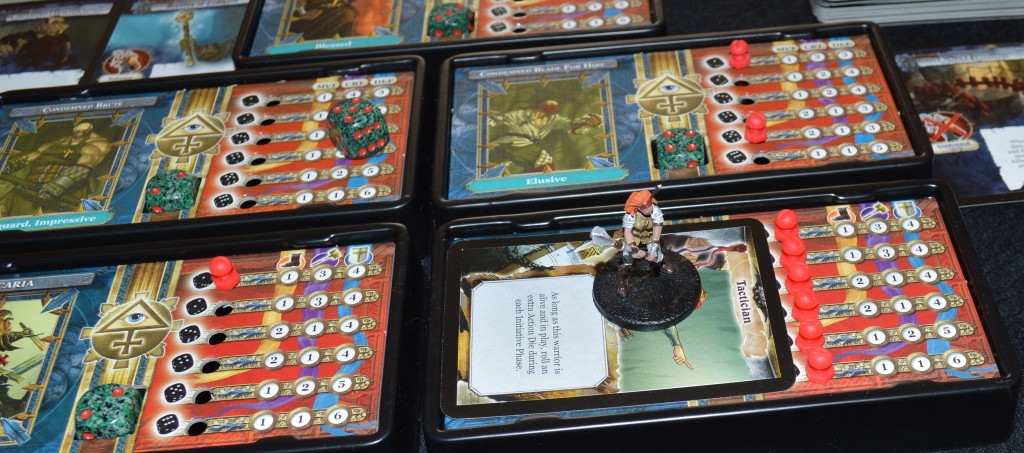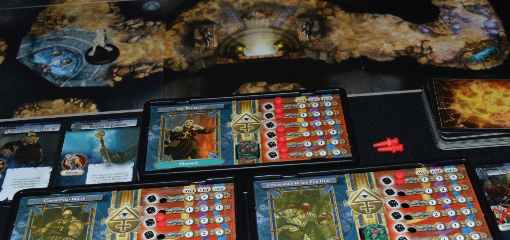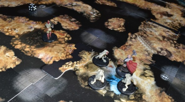 Концовка выдалась занятной. Я вроде бы подготовил почву для выхода Спасителя: Брутом придерживал троглодитов, а Блейдом побежал вперёд, надеясь истребить одним махом целую тучу монстров (на Блейде был пояс смертника со взрывчаткой). Для победы мне нужно было из пяти кубиков выбросить хотя бы одну “тройку” – именно эта линия была “живой” на Спасителе и позволяла сразу же пробежать два тайла и добраться до выхода. К сожалению, “тройку” я так и не увидел. И это за два раунда, которые мне удалось продержаться до того, как Катя снова выбросила 12+.