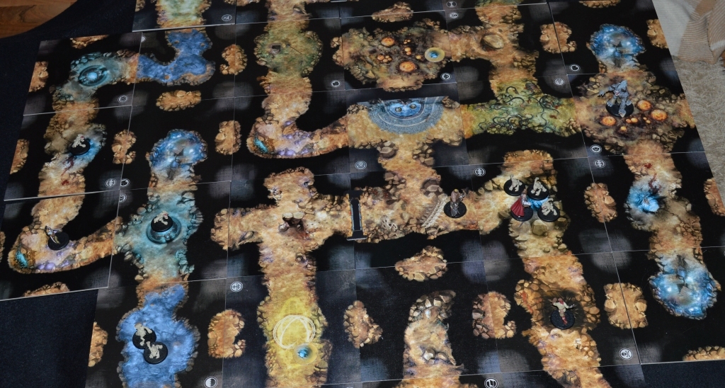Гулять так гулять, подумали мы с Катей и решили разыграть самый громоздкий сценарий из дополнения De Profundis, который называется Maze (Лабиринт). Подземелье для этой миссии формируется заранее и имеет размер 6 на 8 тайлов. Кто держал в руках тайлы из Клаустрофобии, может себе примерно представить то огромное пространство, которое нам потребовалось для партии.