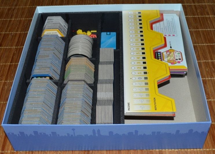 Думал, что первым делом смастерю органайзер для Keyflower, но тут неожиданно анонсировали второе дополнение, поэтому данную затею пока придётся отложить. Вместо этого под нож попала Suburbia, в которую мы играем не реже, и где тоже огромное количество тайлов и ни намёка на внятный инсерт.