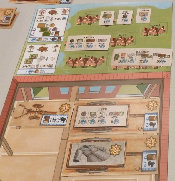 Планшет с хранилищем имеет несколько мест под повозки – это одна из самых интересных находок по мнению автора. С помощью повозок игрок может совершать некоторые действия, не тратя рабочих. Первое – это преобразование ресурсов в товары. Положив, к примеру, дерево, игрок получит древесину, а разместив глину и торф – кирпичи. Плата за такие магические превращения – время (и конечно, ресурсы, потраченные на сооружение повозок). Дело в том, что забрать готовые товары игрок сможет лишь в конце раунда (жетоны переворачиваются и идут в резерв). Таким нехитрым способом из льна можно получить готовые рубашки, из шерсти – носки, а из кожи – куртку. За производство всех этих товаров игрок получит победные очки (они сразу указаны на жетонах).
