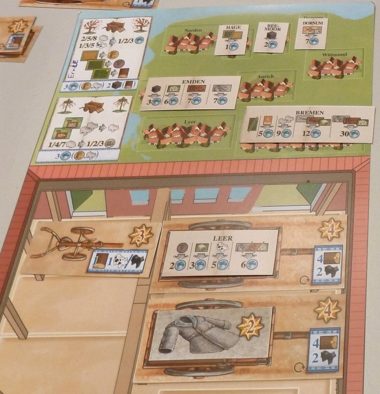 Планшет с хранилищем имеет несколько мест под повозки – это одна из самых интересных находок по мнению автора. С помощью повозок игрок может совершать некоторые действия, не тратя рабочих. Первое – это преобразование ресурсов в товары. Положив, к примеру, дерево, игрок получит древесину, а разместив глину и торф – кирпичи. Плата за такие магические превращения – время (и конечно, ресурсы, потраченные на сооружение повозок). Дело в том, что забрать готовые товары игрок сможет лишь в конце раунда (жетоны переворачиваются и идут в резерв). Таким нехитрым способом из льна можно получить готовые рубашки, из шерсти – носки, а из кожи – куртку. За производство всех этих товаров игрок получит победные очки (они сразу указаны на жетонах).