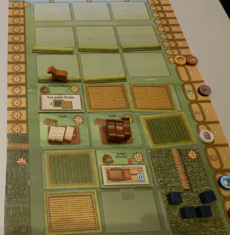 По завершении 9-ого раунда происходит подсчёт очков. Игроки просто суммируют все видимые в звёздочках цифры (на зданиях, товарах и т.д.) и отнимают штрафы (за необработанные участки). Дополнительные и достаточно своеобразные расчёты придётся провести только по животным. Допустим, в конце у меня 4 лошади, 3 коровы и 2 овцы. За животных, которых у меня меньше всего, я получу по 2 ПО (это 4 ПО за 2 овец), за следующих – по 1ПО (3 ПО за 3 коровы), а за самых многочисленных я… не получу ничего. Это сделано специально, чтобы игрок развивался более-менее равномерно.