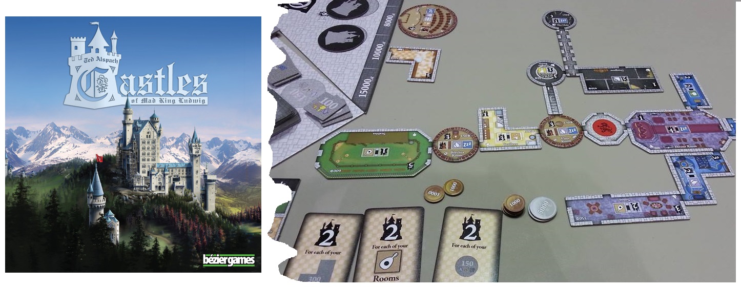 Castles of Mad King Ludwig. Тайлоукладка от автора Субурбии на постройку причудливых замков. Выглядит прикольненько, но процесс вроде как незамысловат – из интересного – механика ставок, когда активный игрок сам задаёт цены на доступные на раунд комнаты и коридоры. (подробнее)