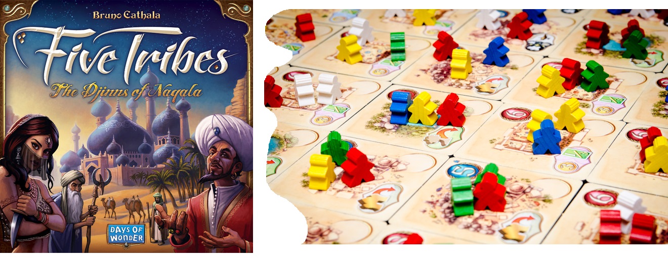 Five Tribes. Евро от Бруно Катала, эксплуатирующее механику древней игры Манкала, которое уже получило свою порцию позитивных отзывов. Игровое поле представляет собой сетку из тайлов-локаций, усеянную миплами разных цветов. В свой ход игрок берёт все фишки с одного тайла и распределяет их по одной по соседним так, чтобы последняя попала в локацию с фишкой того же цвета. Затем он активирует локации и убирает использованных для этого миплов. Судя по всему, игра чрезмерно сухая и противопоказана тем, кто страдает параличом анализа. (подробнее)
