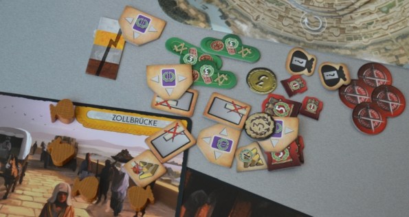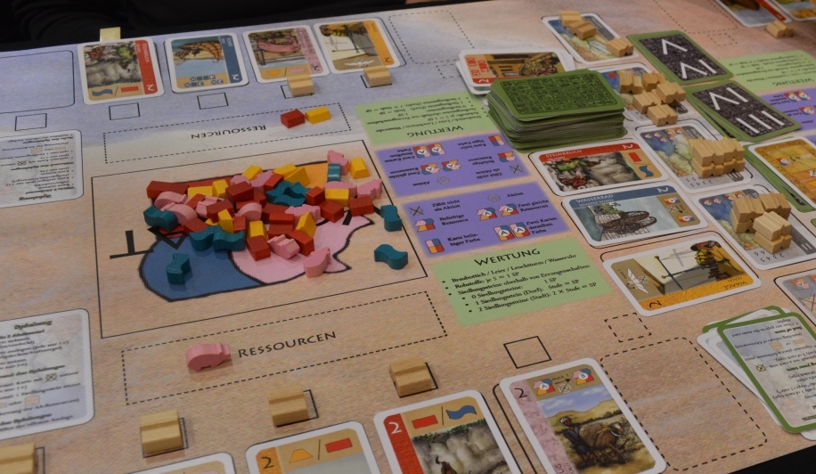 Не обошлось и без косяков. Во-первых, вместо двух фишек, которые забыли положить во все коробки тиража, давали безликие плашки, закупленные издателем там же на выставке на стенде Spielmaterial. Второй недочёт: в правилах, по меньшей мере, в трёх местах фигурируют 5 стартовых карт на игрока, тогда как в комплекте их по 4. Успокоили, что в правилах ошибка, мол, 5 карт было в прототипе. Но всё равно, подозрительно, да и как-то слишком много недочётов для limited edition.