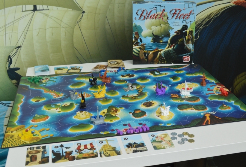 Black Fleet. Внешний вид оставил двоякие впечатления. Металлические монетки и кораблики, без вопросов, здоровские. Вообще, считаю, что возможность помещать грузы/ресурсы непосредственно на транспортное средство – это + 100 к атмосфере. Но вот поле какое-то нелепое, напомнило карты сокровищ из старых советских журналов.