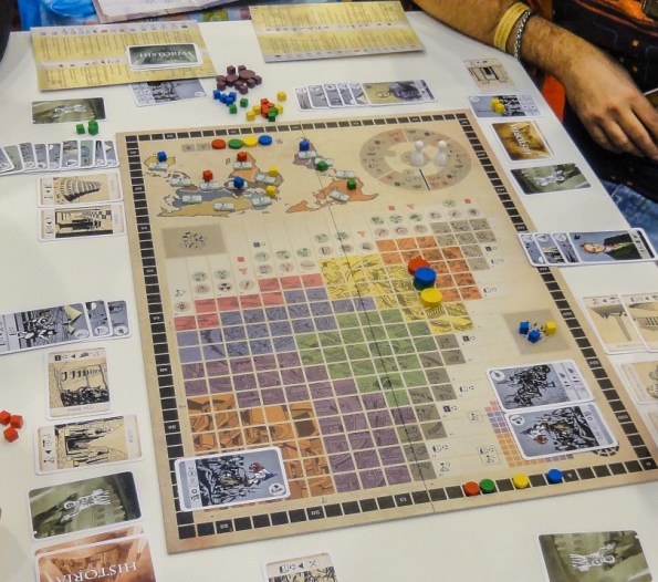 Historia. Была в топе хотелок, но сыграть так и не удалось. В последний день стоял выбор, либо она, либо Hyperborea. Предпочтение отдал второй и не пожалел. Ради интереса глянул потом отзывы о Historia на BGG – пока они совсем не радужные. Помимо ожидаемых жалоб на абстрактность, многие сетуют на очевидность решений и унылый процесс, где нужно лишь передвигать маркеры по матрице технологий.