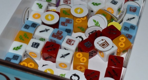 Основную ценность представляют собой 44 кубика и 72 тайла. Без них в коробке ещё имеются поля, горстка жетонов и несколько маркеров. На фоне цены наполнение смотрится довольно скромно. Причину завышенной стоимости понять можно – грех было не воспользоваться популярностью “большого брата”.