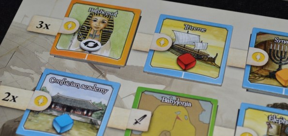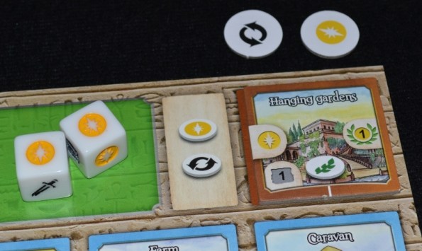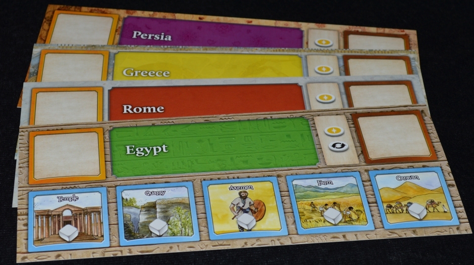 Цивилизация игрока начинается с планшета, на котором изображены жетоны переброса и золота, а также пять зданий со стартовыми белыми кубиками. В течение партии белые кубы можно будет заменить на специализированные и более мощные цветные. Градация по типу и символам следующая: