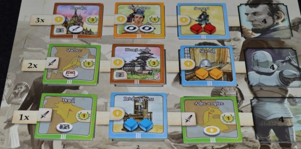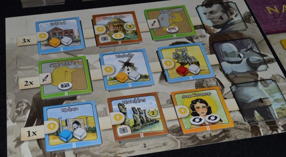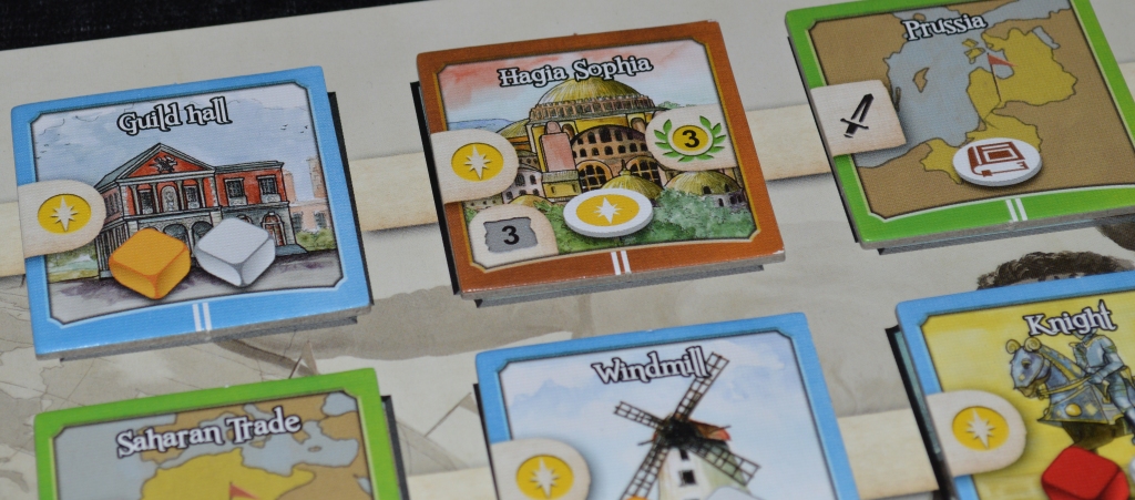 Здания и военные отряды в первой эпохе предлагают по одному кубику соответствующего типа, во второй – по два вместе с базовым, в третьей – по два цветных, а в четвёртой – просто победное очко.