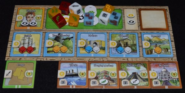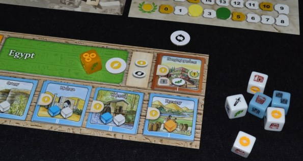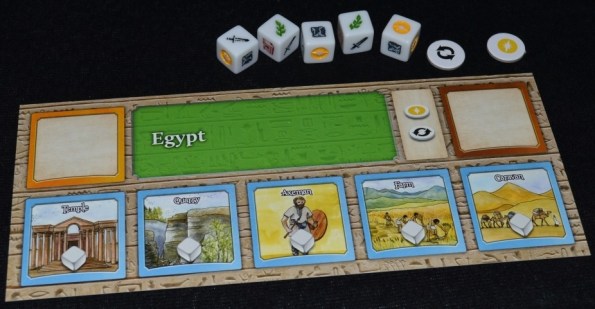 Партия занимает минут 20 и проходит, нет, пролетает, в 4 раунда, во время которых игроки выполняют порядка 10-12 бросков и примерно столько же покупок. Суть процесса остаётся прежней – развить свою цивилизацию. Только в нашем случае задача упрощена донельзя и осуществляется с помощью набрасывания и эффективного использования полученных результатов.