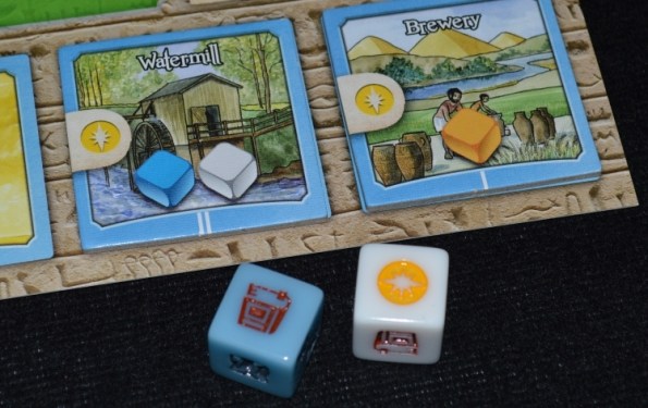 Если тайл даёт жетоны, то они идут в активный пул игрока и могут быть потрачены в текущем раунде. Если тайл приносит кубики, то старые кубики со здания, на которое был помещён новый тайл, возвращаются в общий запас, а новые тут же бросаются – их тоже можно сразу же использовать.
