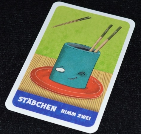 Палочки работают так: если перед игроком лежит такая карта, то в свой ход он может сказать, что использует палочки (или, как настаивают правила – крикнуть “Sushi Go!”), и оставить себе ещё одну карту. Палочки при этом передаются соседу вместе с остальными картами.