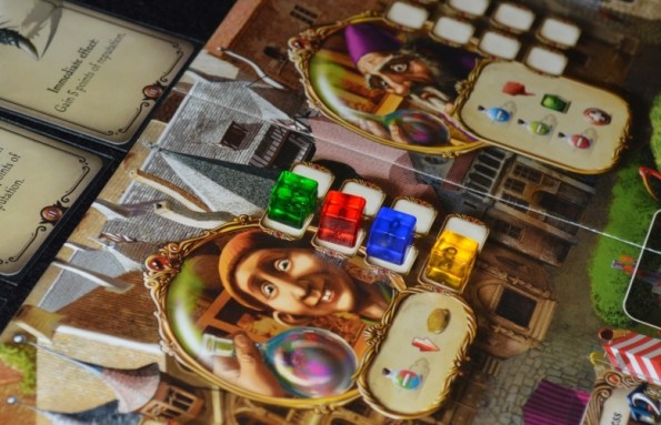 Каждый раунд игроки сперва выбирают, в каком порядке они будут ходить. Делают они это, выставляя по очереди свои фишки на специальный трек. Хочешь иметь преимущество – не видать тебе плюшек. Нужны дополнительные ингредиенты или карты бонусов – посторонись и пропусти других. Кстати, с “преимуществом” первого игрока тут всё тоже довольно интересно. Дело в том, что после распределения мест на треке очерёдности, игроки выставляют свои кубики действий, начиная с последней позиции, помещая их в локации на нижние незанятые клетки. Таким образом, первый игрок не только совершает все действия первым, но и перед распределением своих кубиков видит, что собираются предпринимать соперники.