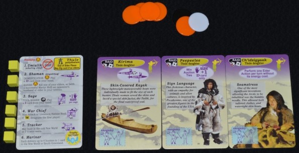Кубики также можно положить напротив желаемых свойств старейшин, сбросив по жетону энергии за каждый. Ещё можно совершить набег на поселение соперника, поместив охотников на карты животных или дочерей другого игрока. И, наконец, можно отправиться в Новый Свет, сделав своих подопечных колонистами. Куда и сколько охотников посылать, игрок решает сам, распределять всех не обязательно.