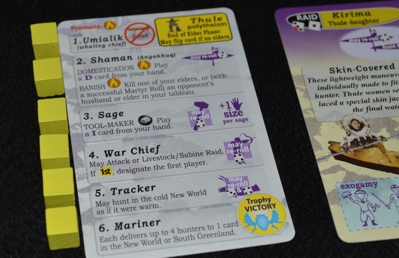 Карта старейшин также предлагает ряд дополнительных свойств, которые активируются за кубики и жетоны ресурсов. Кроме того, она указывает на текущее вероисповедание племени. От того, какого религиозного мировоззрения придерживается племя – политеизма (вера одновременно в нескольких божеств) или монотеизма (единобожие), зависит, за что получит победные очки игрок в конце партии. Что касается самих старейшин, то их шесть типов, и все они доступны изначально, что отмечается кубиками, которые кладутся напротив свойств. Старейшины позволят совершать дальние экспедиции и достичь Нового Света; атаковать соперников, разыгрывать карты с руки и тоже перебрасывать кубы.