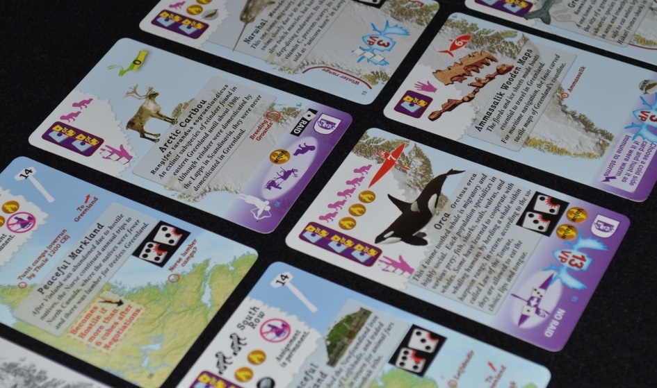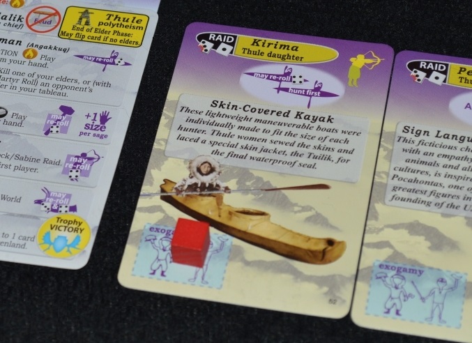Именно этим мне игра и понравилась. Автор не пытался сгладить углы, что-то упростить, а просто дал игрокам полную свободу и снабдил всё это отсылками к реальным событиям, позволяющими проследить логику любого действия. Да, чтобы разобраться со всем этим, пришлось попотеть, но результат того стоил. Соревнование за очки получается напряжённым, и ты сам не замечаешь, как попутно вживаешься в роль древних охотников, на глазах которых Гренландия постепенно затягивается покрывалом из непроходимых льдов. Да и все эти постоянные стычки добавляют веселья. У нас всё время возникали всякие шуточки, особенно, по поводу женитьбы. Не удалось кинуть успех при набеге на карту дочери, значит, как увидел – передумал!