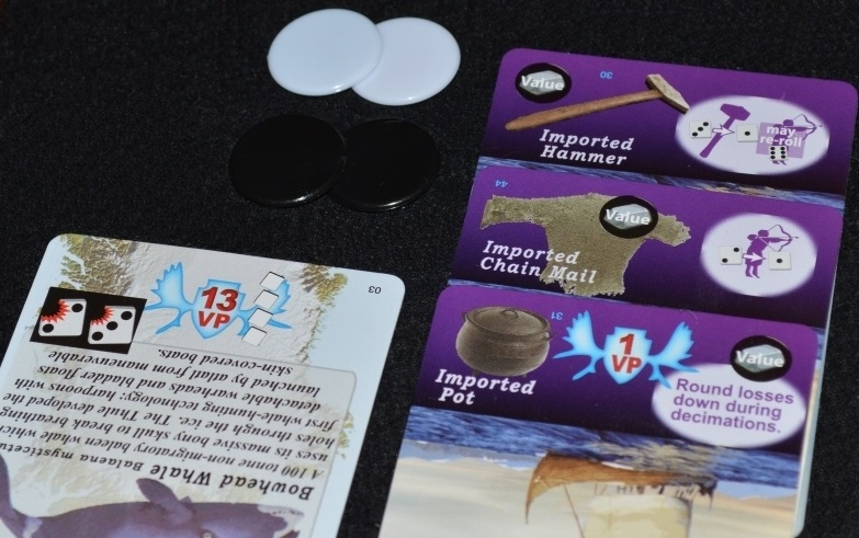 В общем, ничего хорошего события обычно не несут, за исключением судов, которые изредка причаливают к берегам острова и охотно идут на обмен с местными жителями. Если на карте события нарисован корабль, то в конце данной фазы игроки могут поторговаться за привезённый товар – оружие или инструменты, которые опять же в большинстве случаев помогут в модификации значений кубиков. Ставки делаются единственным ресурсом, представляющим ценность для “цивилизации” – бивнями. Кто предложит больше, тот и кладёт карту перед собой, перевернув её свойством вверх.