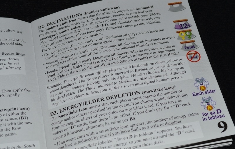 Получилось как-то много, но это я ещё в детали не вдавался. Такие как возможность избежать потерь во время охоты и набегов, заплатив жетон железа; или в любой момент сбросить карты и получить указанные на них ресурсы. Из-за старания автора максимально чётко передать атмосферу того времени, нюансов в игре скопилось множество. Более того, в сети выложены “живые” правила, которые постоянно обновляются и обрастают всё новыми пунктами и подпунктами. Всё это я к тому, что порог вхождения тут чрезвычайно высокий, и дело не только в нюансах.