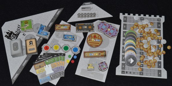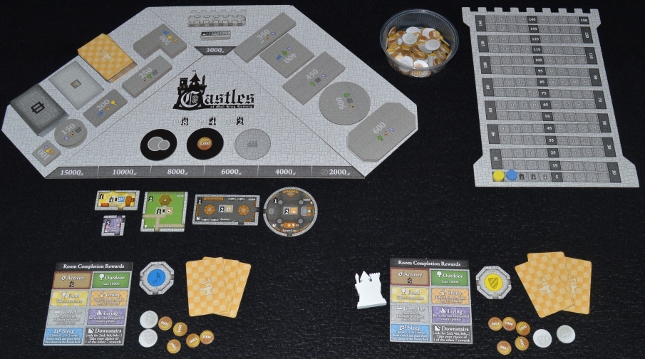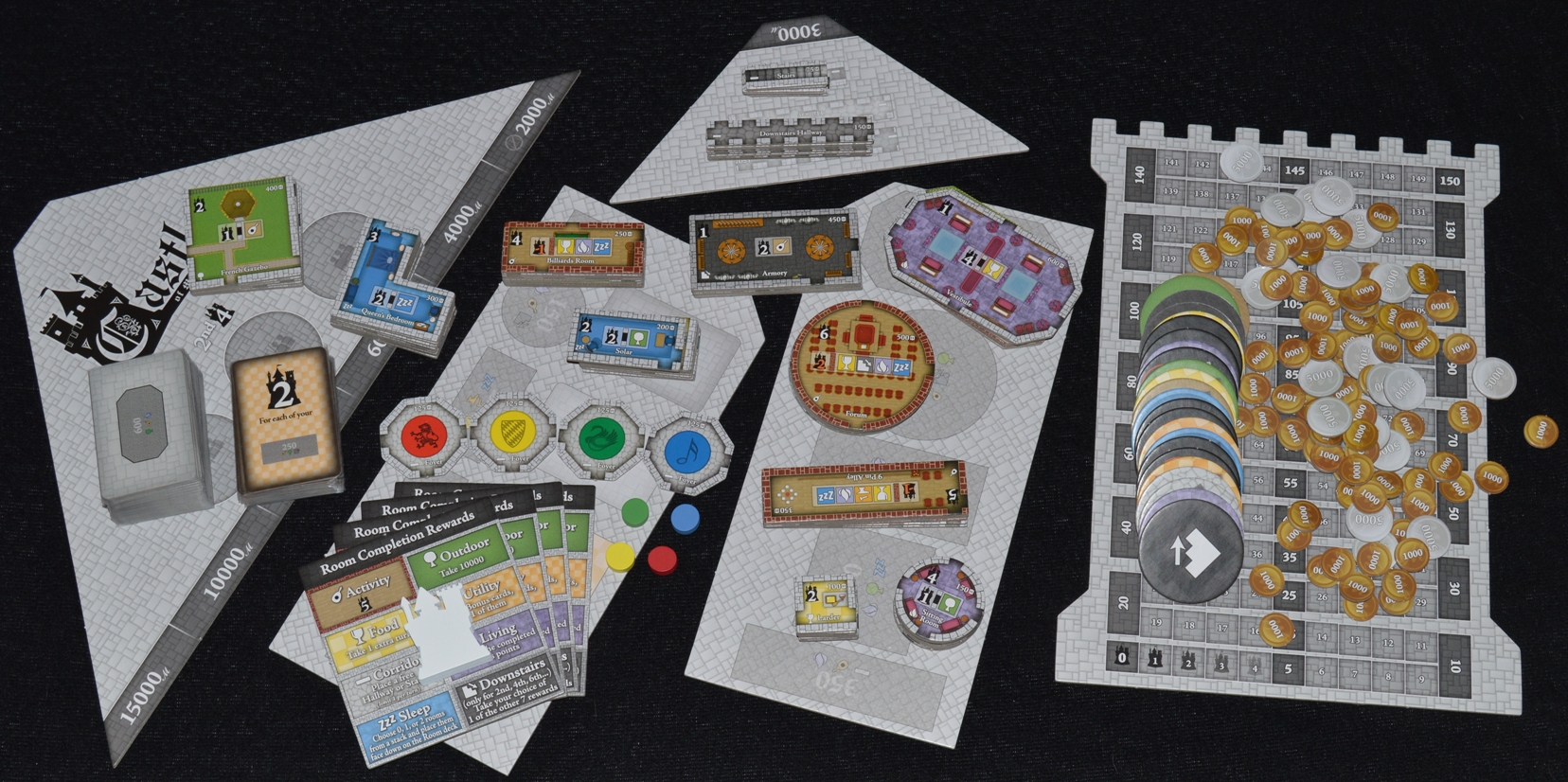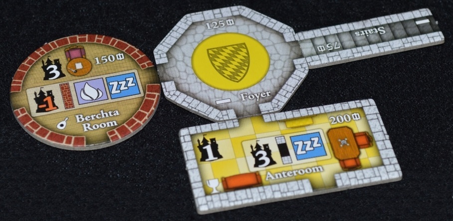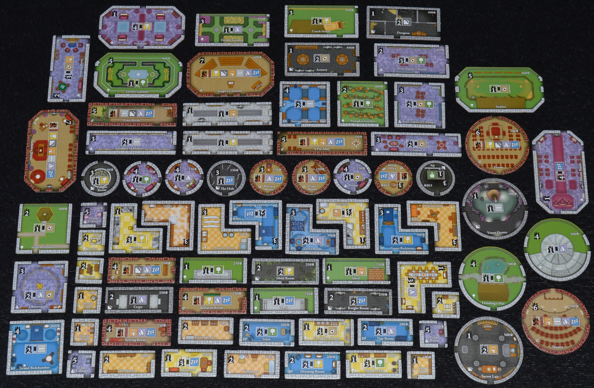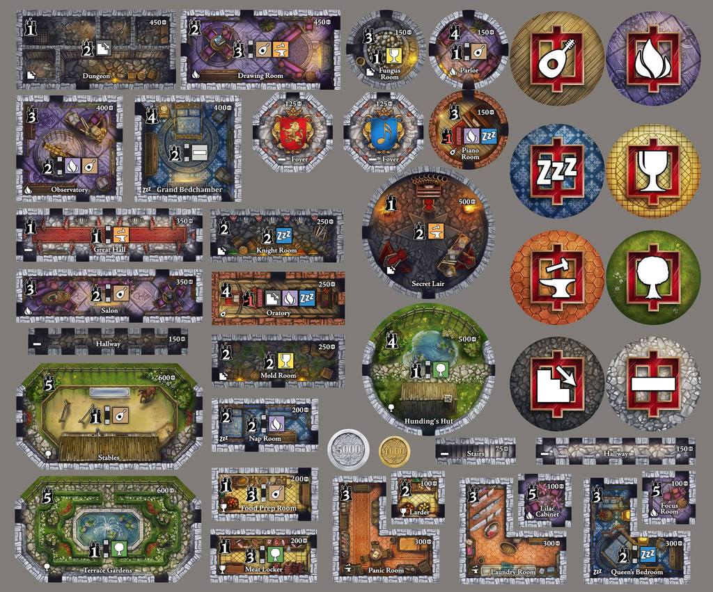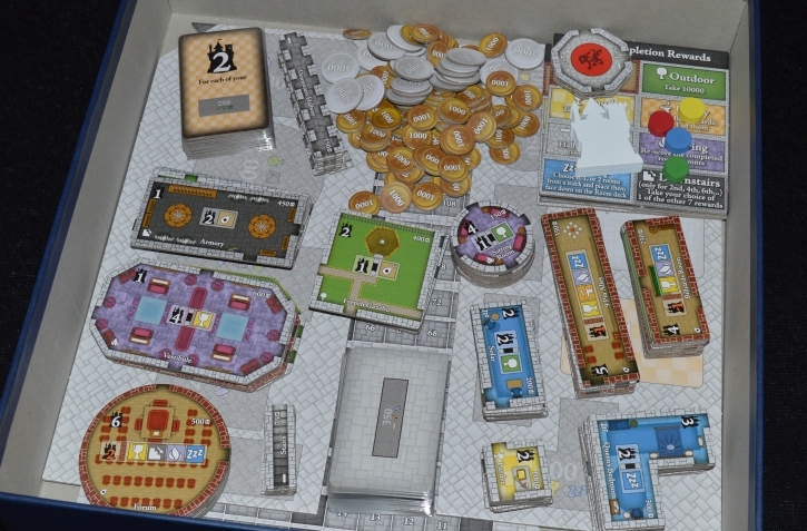 И напоследок, небольшая ложечка дёгтя в этом сладком сиропе. Касается она компонентов. Конечно, для такой цены их маловато, болтаются где-то на дне коробки, но дело не в этом. Дело в оформлении. Вся красота заканчивается на иллюстрации с обложки. Бледные карты комнат, простоватые карты бонусов, убогонькие монеты, серые невзрачные поля – всё это совсем не вписывается в антураж развесёлых и помпезных замков. Ситуацию немного исправляют красочные тайлы комнат, но это пока ты не увидишь…