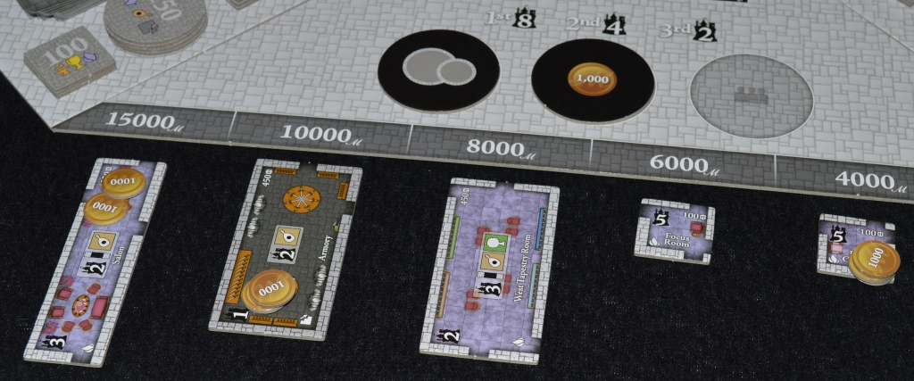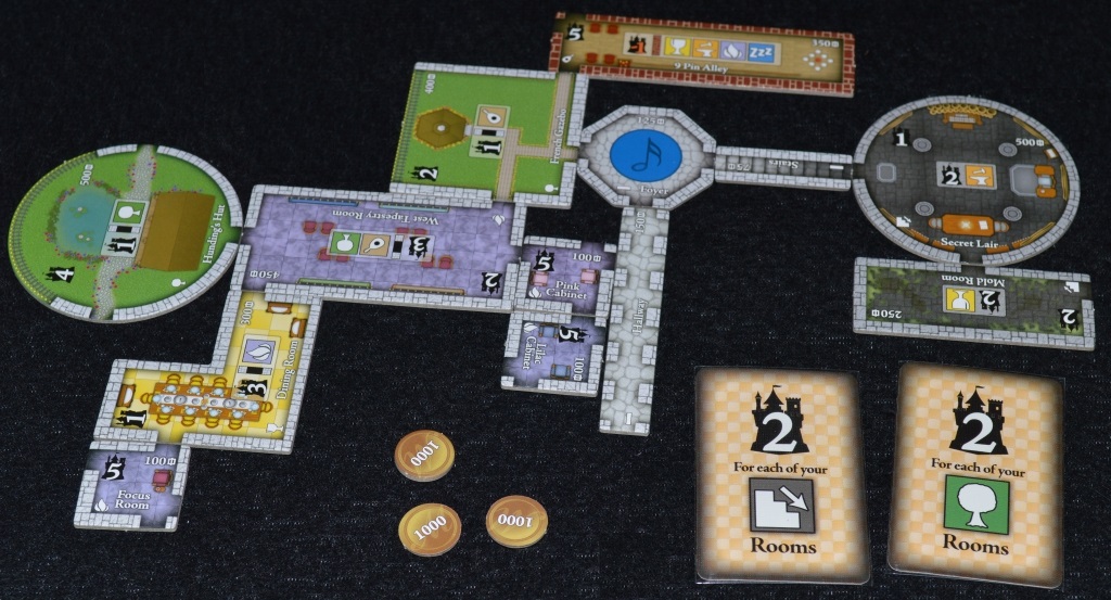 Во-первых, начисляются очки за саму комнату, указанные в верхнем левом углу. Во-вторых, за свойство комнаты, если она подсоединятся к тайлу указанного типа. В-третьих, проверяется, не сработал ли такой же эффект у смежных комнат или подвальных помещений (они приносят очки за определённый тип, вне зависимости от места расположения). И, наконец, смотрится, не была ли завершена какая-либо из комнат (это когда все её выходы застроены, т.е. ведут в другие помещения). Если да, то игрок получает специальный бонус согласно её типу: деньги, очки, возможность повторно “заскорить” комнату, просмотреть любую из стопок тайлов и выбрать один или два, которые точно выйдут в следующем раунде, взять две карты тайных целей и оставит себе одну, или даже совершить дополнительный ход.