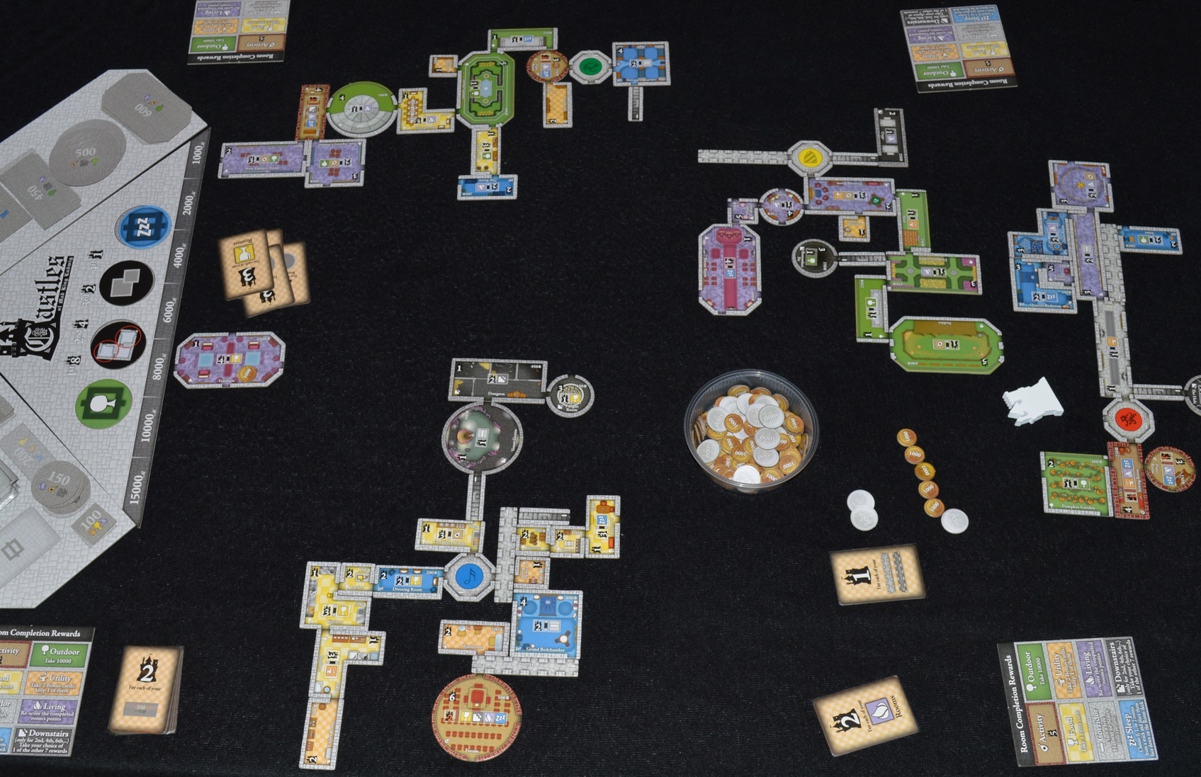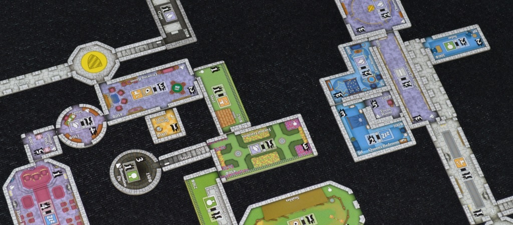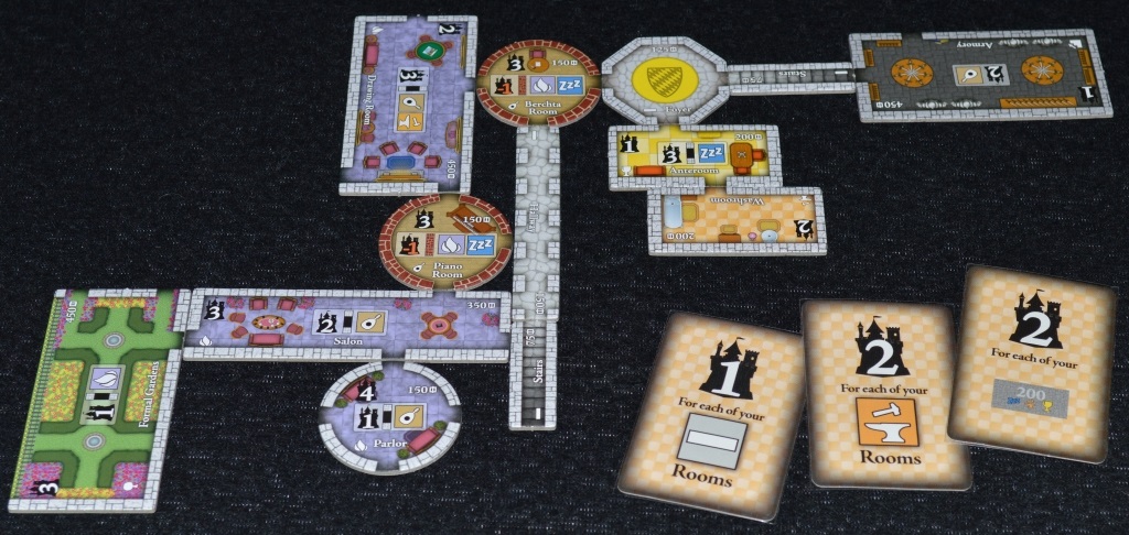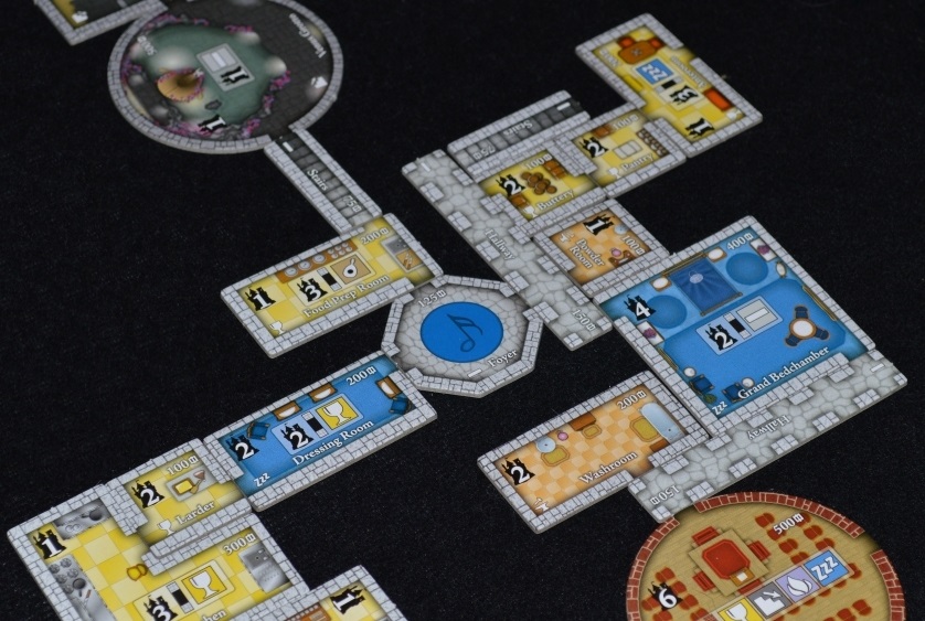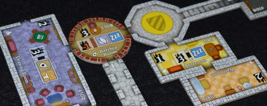 Во-первых, правила. Они невероятно просты. Каждый раунд покупаем новые комнаты, пристраиваем их к своему замку согласно паре простейших условий и стараемся получить за это как можно больше победных очков, а также выполнить общие и собственные тайные цели.