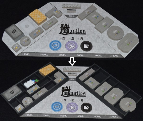 Вчера вечером за пару часов сварганил два лотка для компонентов из Castles of Mad King Ludwig. Органайзера там не предусмотрено, поэтому во время подготовки приходилось немного повозиться, чтобы рассортировать тайлы по типу, а потом разложить их на специальные поля.