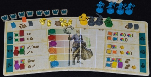 Опять же по своему усмотрению каждый вправе выбрать три линейки развития, и разместить маркеры на первое, второе и третье деление. Прогресс по треку означает, как скоро игрок сможет пополнить свой мешок одним или сразу двумя кубиками указанного цвета.