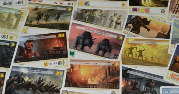Второй примечательный момент, отвечающий уже за разнообразие путей развития – это карты технологий. На них авторы не поскупились, карт 64 штуки и почти все они уникальные. Технологии также отлично дополняют основную механику, ведь с увеличением числа кубиков в мешке действий на планшете становится недостаточно.