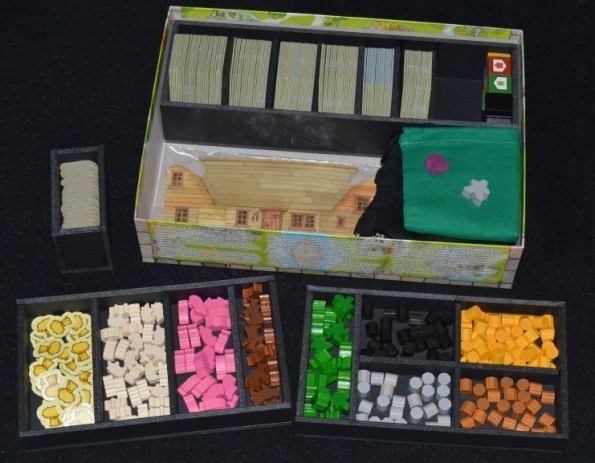 Сразу полегчало! В итоге было склеено четыре коробочки – одна для ресурсов, другая для скотинки и пшеницы, третья для тайлов деревни, фишек домов и пристроек, в которой, в свою очередь, уместилась ещё одна с жетонами контрактов.