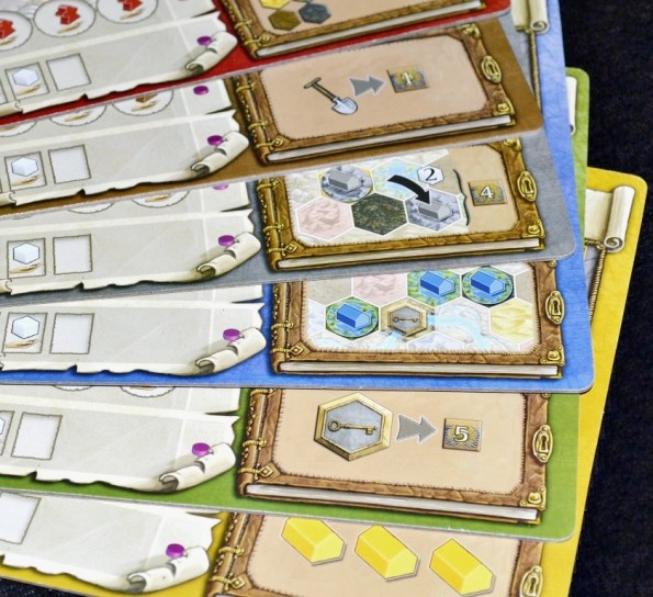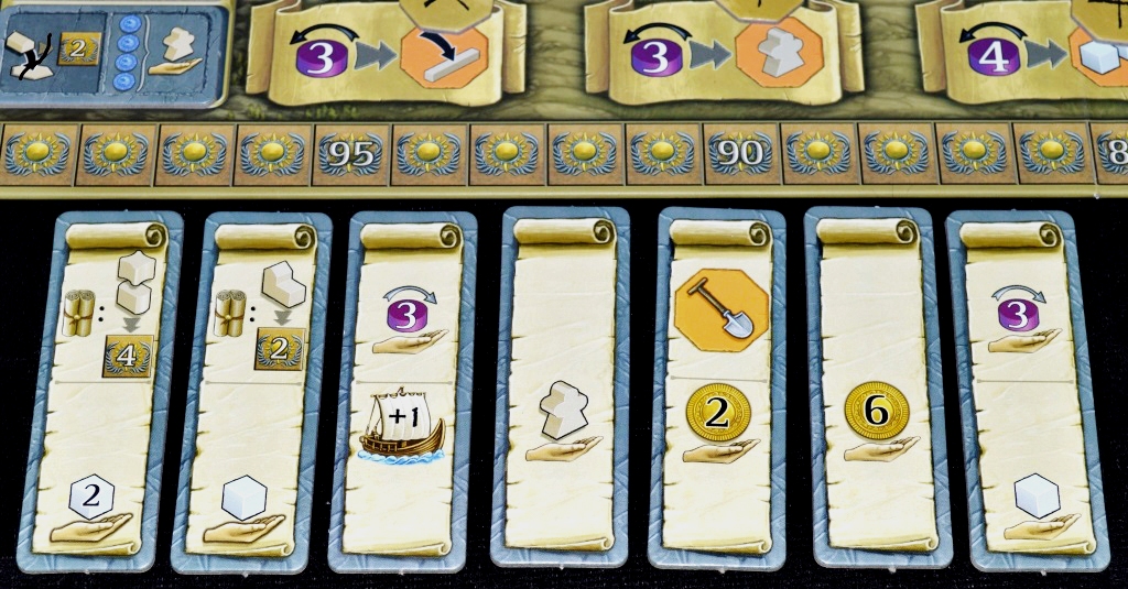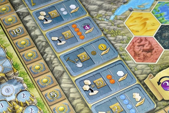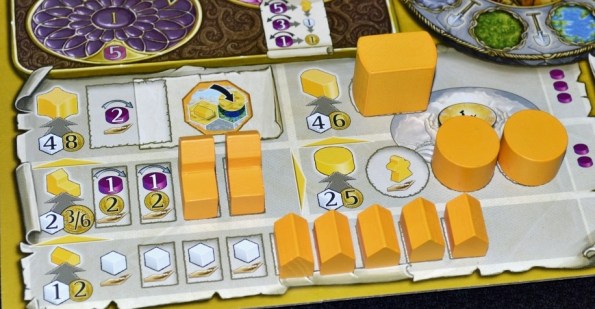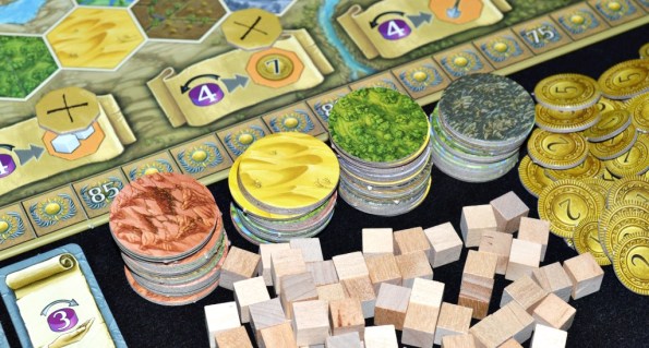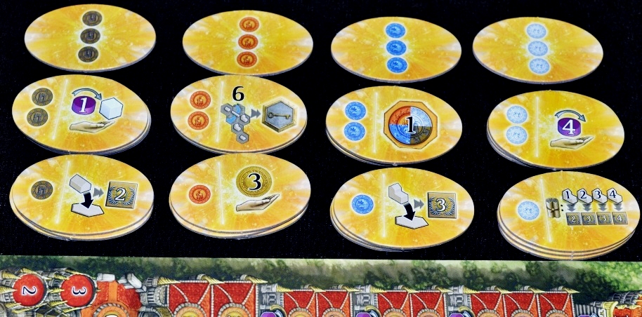 Под фишками прячется доход игрока в монетах/рабочих/силе, который становится доступным после строительства. Окинул взглядом планшет, подсчитал видимые ресурсы, взял из запаса. Очень удобно.