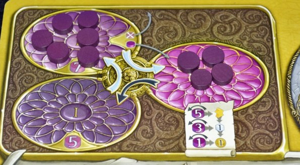 Работает эта система следующим образом. Получая силу, игрок сперва перемещает указанное число дисков из первой чаши во вторую. Если первая пуста, то из второй в третью. А вот из третьей силу уже можно тратить. Чтобы ускорить циркуляцию или побыстрее заполучить пару недостающих фишек, силу можно сжигать – за каждую уничтоженную во второй чаше таблетку, игрок может переместить одну таблетку в третью.