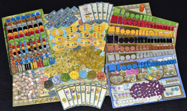 Компоненты, безусловно, одна из сильных сторон TM. Гора картона и деревяшек порадует глаз даже самого искушённого еврофила. Чтобы уместить всё это добро, стандартную прямоугольную коробку пришлось слегка увеличить по высоте.