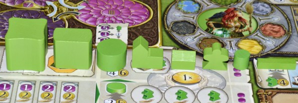 Обыграна взаимовыгода довольно любопытно. Дело в том, что когда другой игрок возводит или улучшает постройку, то тот, кто находится рядом, может решить прокрутить количество фишек силы согласно типам прилегающих зданий, заплатив за это победными очками.