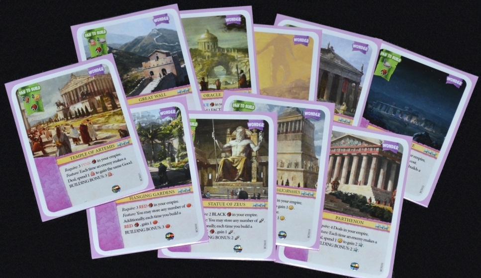 Чудеса работают следующим образом. В начале партии получаем четыре карты, оставляем себе две. Строятся, как обычные здания, единственное отличие – появляется дополнительное требование в виде определённого числа локаций конкретного цвета. Чудеса дают 3 ПО, имеют неплохие свойства, и их нельзя разрушить.