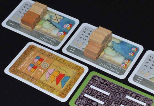 Когда с карты эпохи берётся последняя фишка, срабатывает эффект бедствия (сдаёшь определённые ресурсы или получаешь штраф), и игроки торжественно вступают в новый век, где строительство дорожает. Затем переворачивается карта события, оповещающая о дополнительном требовании к постройке и новом испытании.