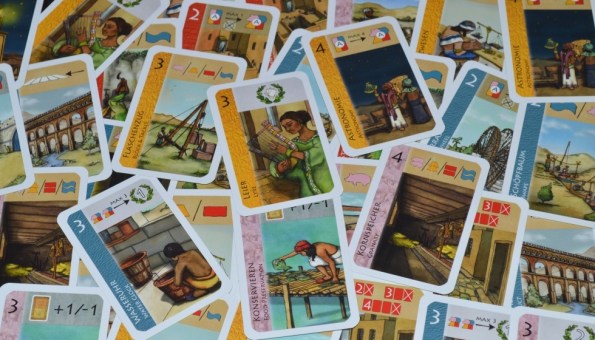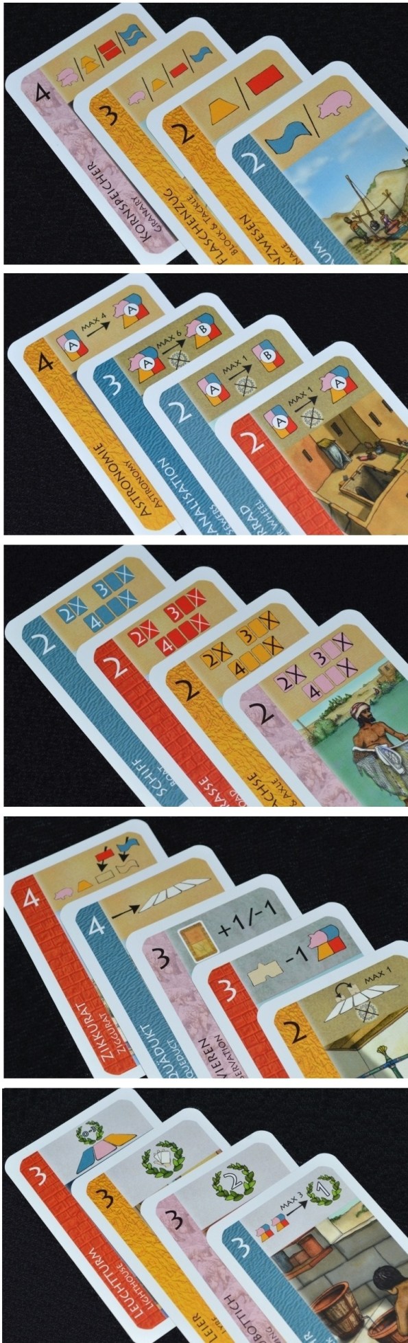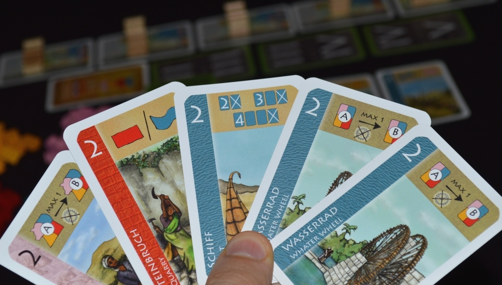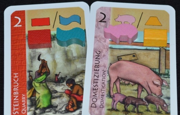Как видно, в игре два типа ресурсов, обычные – еда, вода, золото и камень, требуемые для строительства фишек и преодоления бедствий, и карты. Сбор чуть ли не покерных комбинаций из свиней и слитков золота, затея, конечно, любопытная, но мне больше приглянулась необходимость собирать карты по цветам и сбрасывать их в угоду внедрению изобретений. Такой принцип не так часто встретишь в других настолках, плюс, как я уже говорил, он провоцирует кучу дилемм, которые заставляют мозг работать.