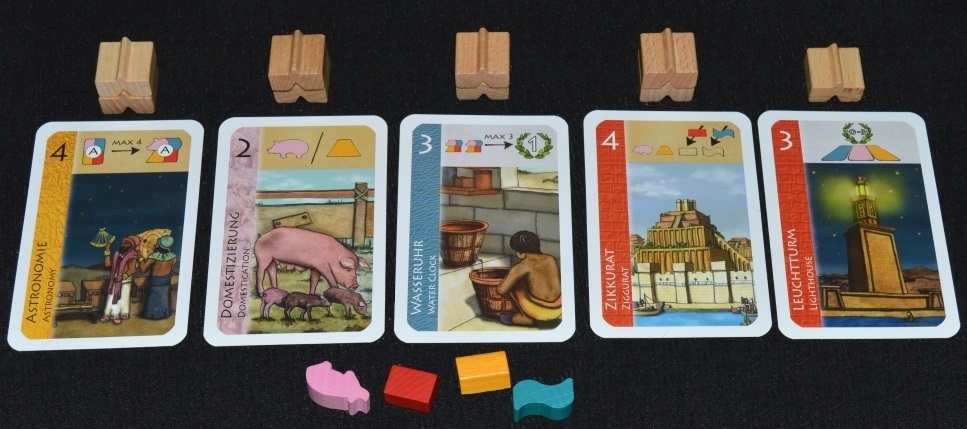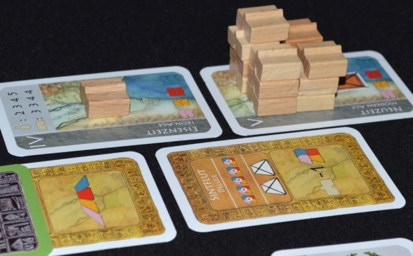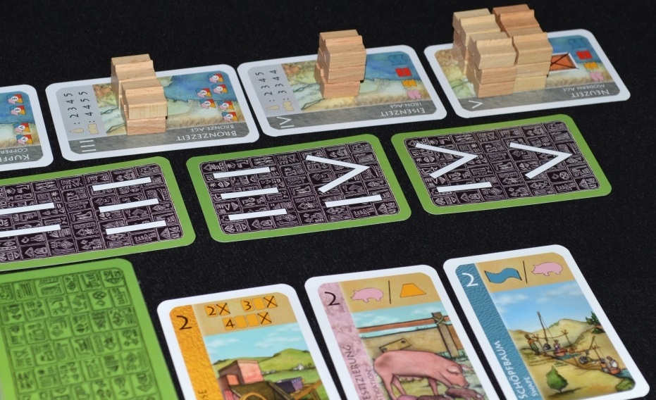 Далее нужно организовать временной трек и сдобрить его картами событий. Карты эпох выкладываются по порядку, а на них кладутся фишки поселений по числу игроков. Эти карты указывают стоимость постройки фишек в комбинациях ресурсов. Допустим, в каменном веке придётся скинуть пару ресурсов одного типа, а в медном – две пары двух разных типов. Комбинации почти покерные.