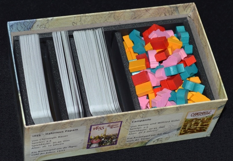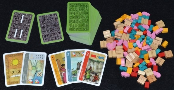 В компактной коробке разместилась горсть ярких деревянных ресурсов и колода, состоящая из карт эпох, событий, изобретений и благодати.