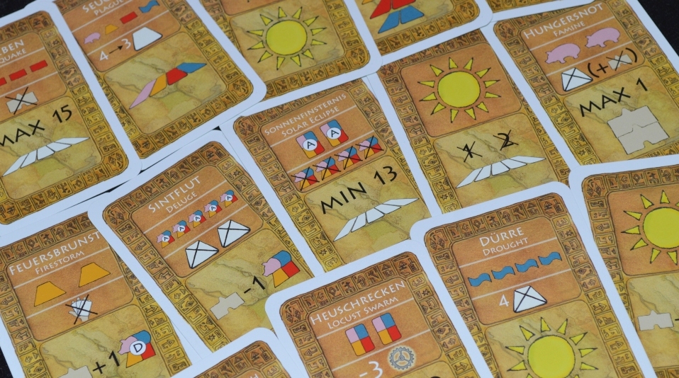 Остались карты событий. Они размещаются таким образом, что одна половина относится к текущей эпохе, а другая – к следующей. Верхняя часть обозначает бедствие, которое случится по завершении эпохи. Там говорится, какие ресурсы игроки должны скинуть, чтобы не получить штраф. Нижняя указывает на дополнительное требование к строительству поселений/городов.