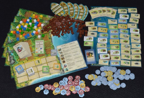Вывалить содержимое на стол и так просто начать партию не получится, потому что практически всё в PR завязано на количестве игроков. То есть баланс достигается не только за счёт выверенных механик, но и благодаря масштабируемости компонентов: победных очков, рабочих, доступных зданий, используемых лодок и тайлов ролей. Тут даже стартовые монетки и плантации выдаются согласно строгим предписаниям.