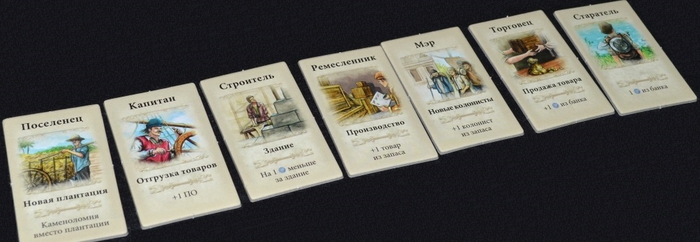 Взяв поселенца, игрок позволит всем получить по плантации. Бонусом для него станет возможность пристроить каменоломню, предоставляющую скидку при покупке зданий. Мэр снабжает всех рабочими, предлагая выбравшему дополнительного. С помощью строителя, дающего скидку в 1 монету, покупаются здания, а с помощью ремесленника производятся товары. Бонус выбравшему ремесленника – дополнительный товар из произведённых по выбору. Старатель – это, скажем так, утешительное действие, оно приносит одну монету, но лишь тому, кто взял эту роль.